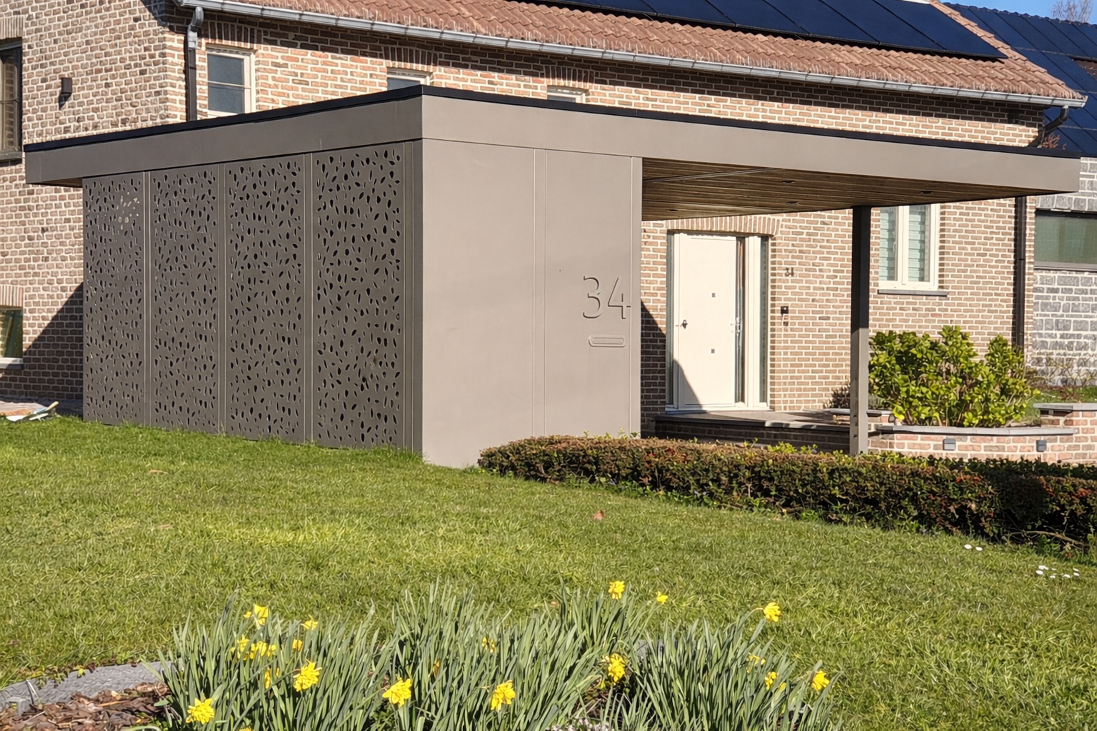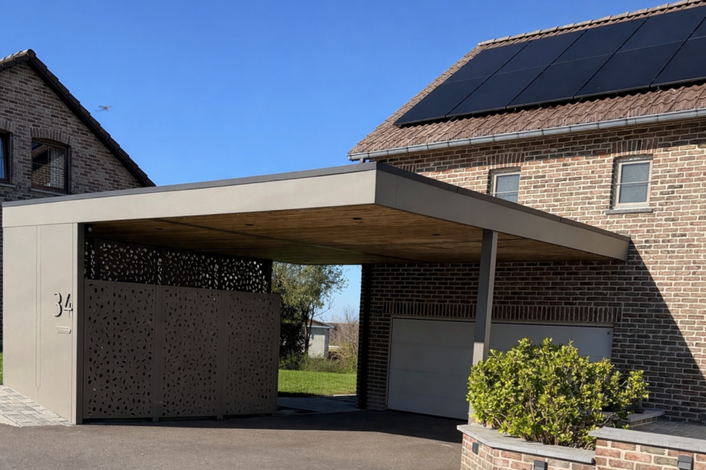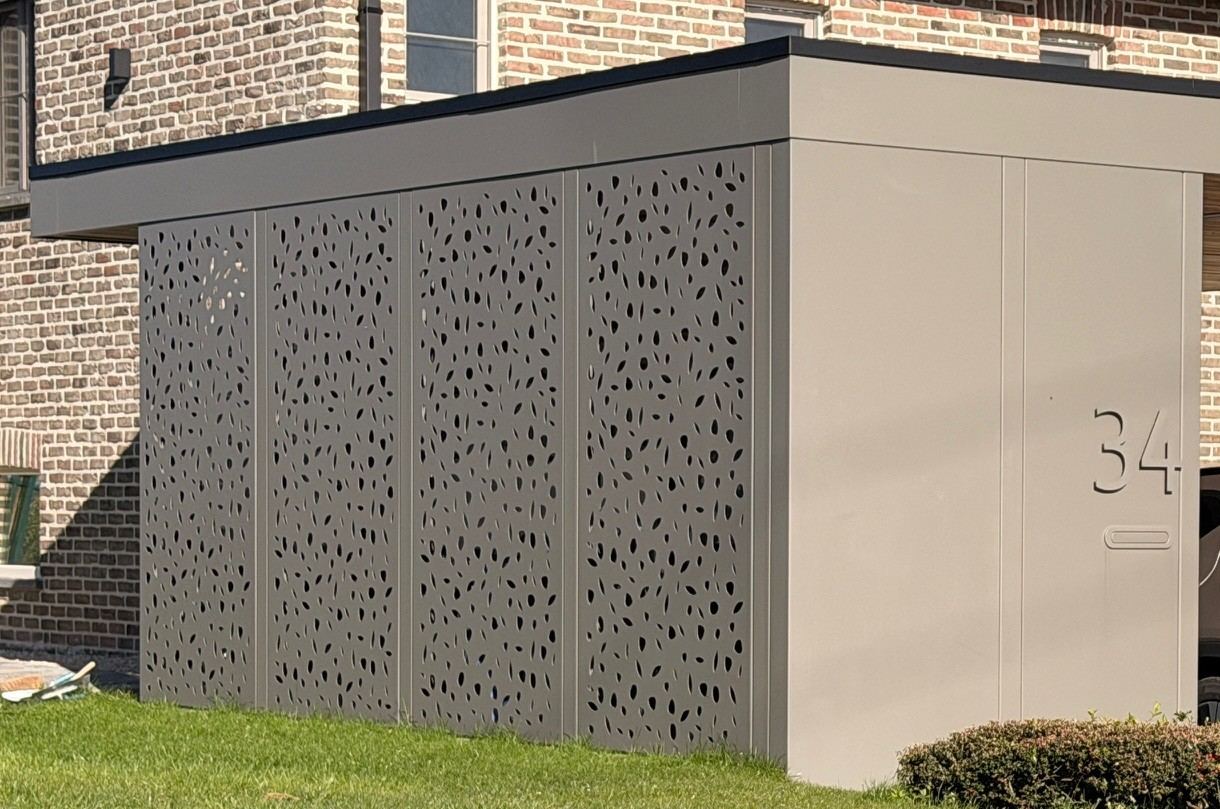 Carport et local poubelle garni de tôles découpées