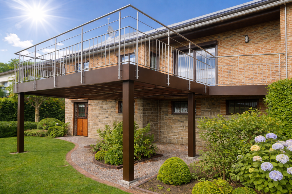 agrandissement d’une terrasse en acier galvanisé poudré + garde-corps à barreaux verticaux en inox