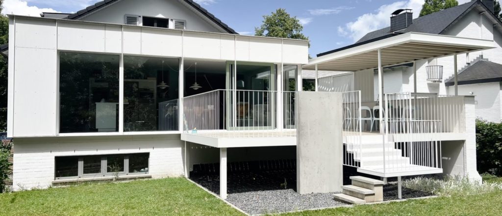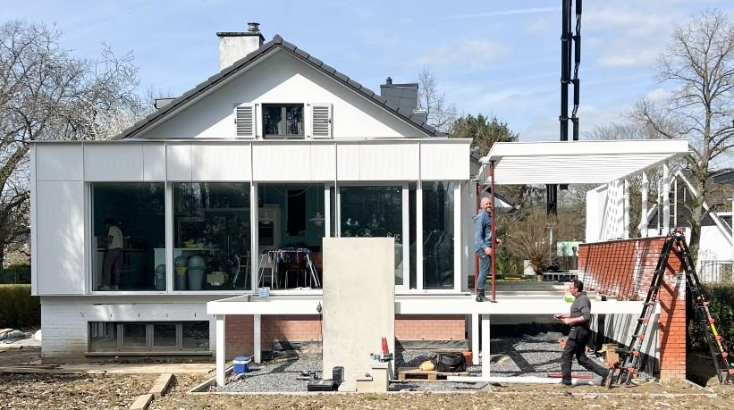Ensemble composé d’une grande terrasse, en partie couverte d’une pergola, et escalier en tôle perforée.