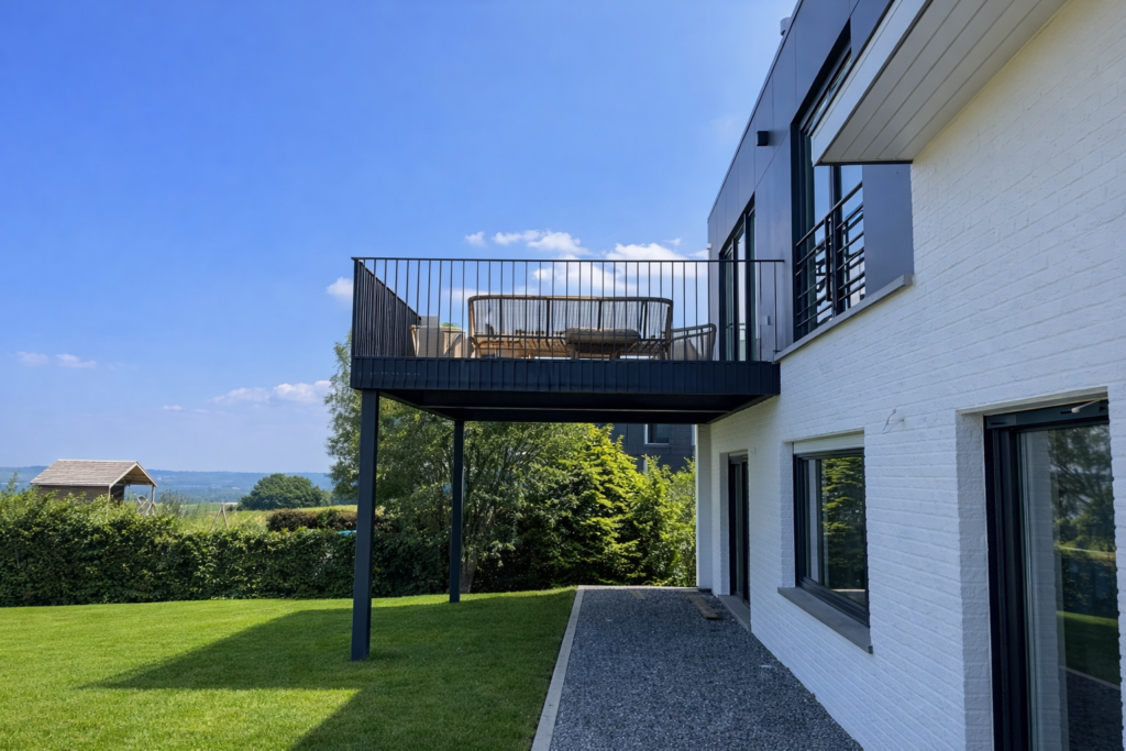 Accessoires | Extérieur | Garde-corps | Terrasses - Passerelle Terrasse + garde-corps à montants verticaux Terrasse sur colonnes en acier sablé, métallisé, poudré. Garde-corps à barreaux verticaux en plat. Prev Project Next Project